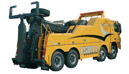 6 - HYDRAULIC DEVICE It is fed by a hydraulic axial piston pump applied to the chassis PTO. A proportional distributor deviates the oil in pressure to various elements which move the equipment. On the various groups are fitted locking valves which assure the stability of the complex in case of accidental burst of some hoses. The hydraulic device is equipped with oil filters. A electro hydraulic discharge valve, every time a mushroom push bottom is operated for emergency stop, drains the main hydraulic feed, locking all the movements. Max pressure valves grants the safety and the minimum performances declared . Studied specifically to recover/rescue breakdown heavy trucks by means of a boom appropriately equipped and towing of the trucks, with axle lifted up, by a fork.